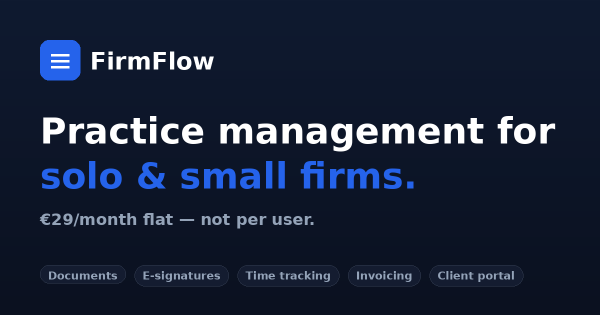 FirmFlow is an all-in-one practice management platform for solo and small professional firms — accountants, lawyers, consultants, and bookkeepers. The platform consolidates document management, e-signatures, time tracking, invoicing, client portal, and an AI assistant into one product priced flat at €29-89/month for the entire team, regardless of headcount.